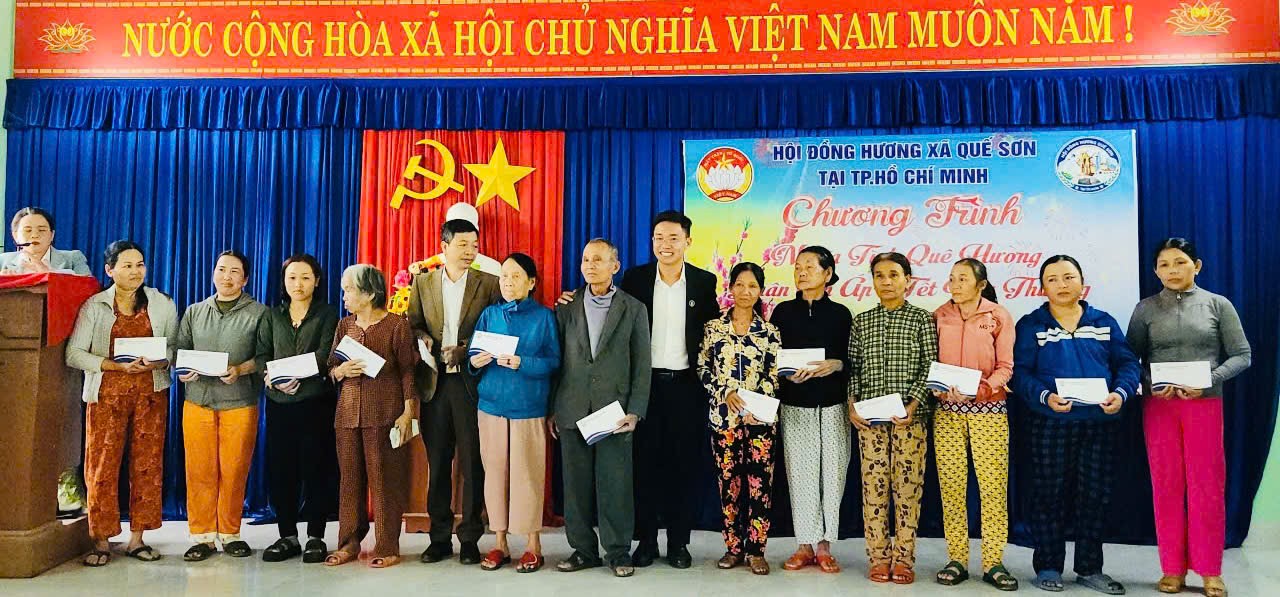 Tại chương trình, Hội đã trao quà cho các em học sinh vượt khó, học giỏi của Trường THPT Quế Sơn, đồng thời trao quà Tết cho các hộ gia đình khó khăn. Hơn 600 phần quà, với tổng trị giá trên 300 triệu đồng, đã được Thường trực Hội đồng hương Quế Sơn tại TP.HCM cùng đại diện lãnh đạo Đảng uỷ, UBND, UBMTTQVN xã Quế Sơn trao tận tay bà con, góp phần mang đến một mùa xuân ấm áp, nghĩa tình.